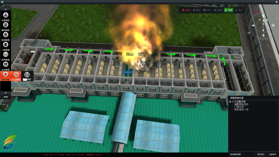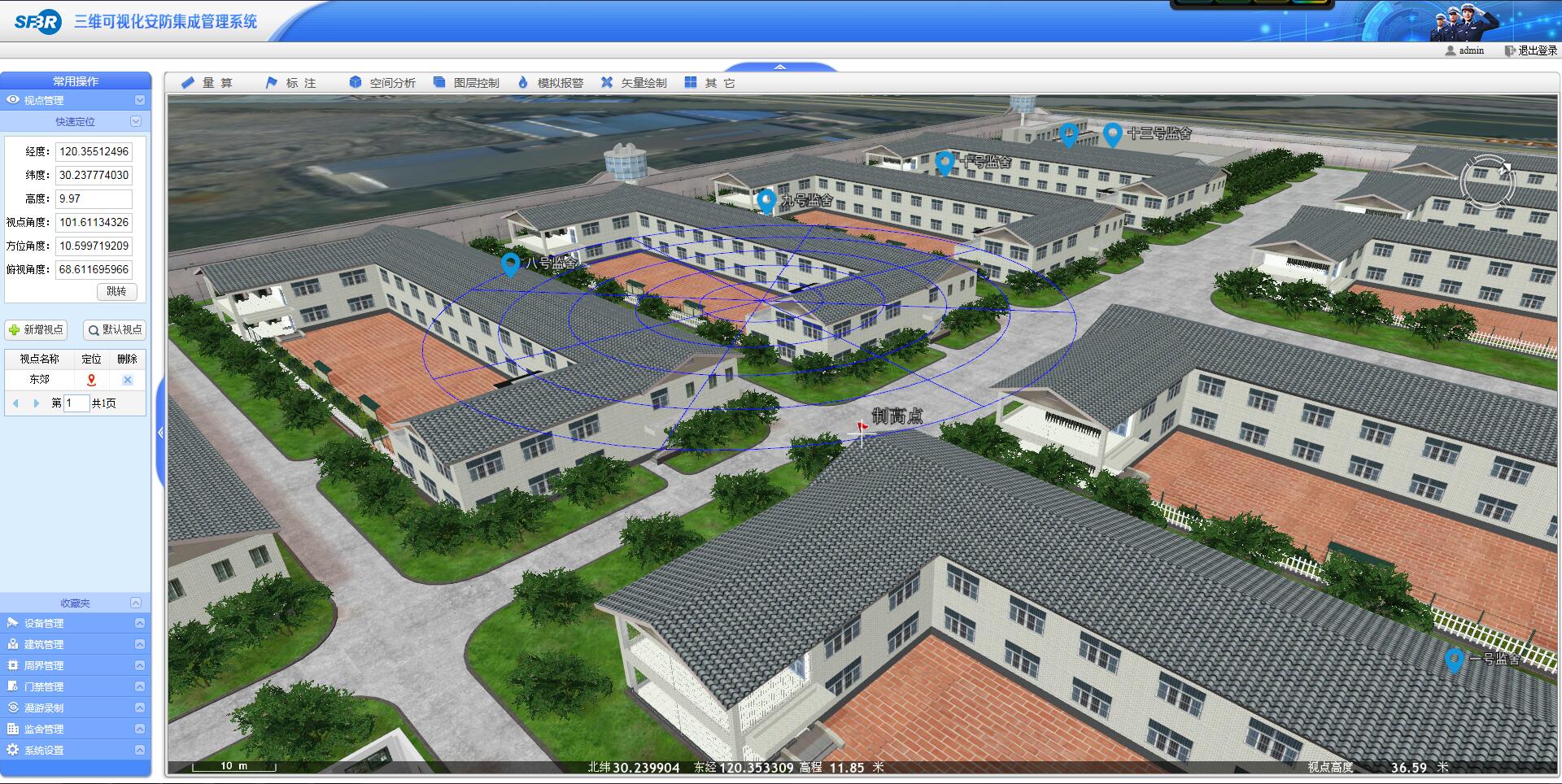 以VR(虛擬現(xiàn)實)、3DGIS(三維地理信息系統(tǒng))、RFID、物聯(lián)網(wǎng)、OLTP/OLAP等技術(shù)為基礎(chǔ),通過對管轄范圍內(nèi)建筑、地貌、交通、植被等地理信息和安防硬件設(shè)備等物件3D精細建模,實現(xiàn)場景三維立體還原,對地理信息、資產(chǎn)信息、人員信息、重點時段、重點人物、重點區(qū)域、重點事件的可視化管理,實現(xiàn)對突發(fā)事件信息鎖定、智能聯(lián)動、預案部署、應(yīng)急通訊調(diào)度等應(yīng)急處突的三維立體可視化指揮。