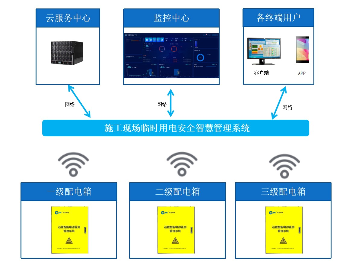 施工現(xiàn)場(chǎng)配電箱臨時(shí)用電的接線存在電線老化、破損、接頭不好及搭接在鐵質(zhì)器件上、接地系統(tǒng)沒(méi)有采用TN-S系統(tǒng)、PE線和N線混淆不清、開(kāi)關(guān)箱無(wú)漏電保護(hù)器或漏電保護(hù)器失靈、移動(dòng)電氣不采用“一機(jī)一閘一漏一箱”、電氣設(shè)備無(wú)接地、接零措施等問(wèn)題,通過(guò)系統(tǒng)的部署對(duì)引起用電不安全的主要因素(線纜溫度、電流、剩余電流、三相平衡、大火等)進(jìn)行實(shí)時(shí)在線監(jiān)測(cè)和統(tǒng)計(jì)分析,避免電氣火災(zāi)安全事故發(fā)生。